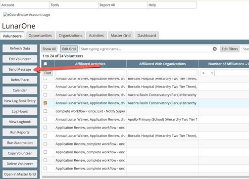 The Messaging tool is context-aware, meaning it adapts to the work you are doing at that moment. The profile tab you open the messaging module from (Volunteers, Opps, Orgs, etc.) is important because it automatically adjusts three key things.