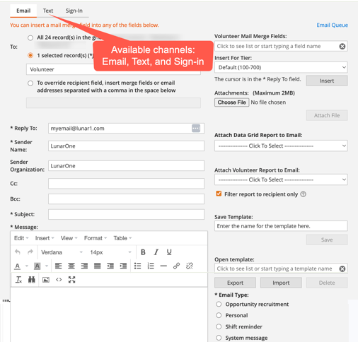 The Messaging tool allows you to speak to your volunteers and coordinators through three distinct pathways: Email, Text, and Sign-in.