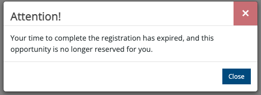 Once a user begins the sign-up process, they will receive messages indicating they have a limited amount of time (based on the “Placement Reservation Time” value, in minutes) to complete the form. These messages help guide the user through the time-sensitive process.